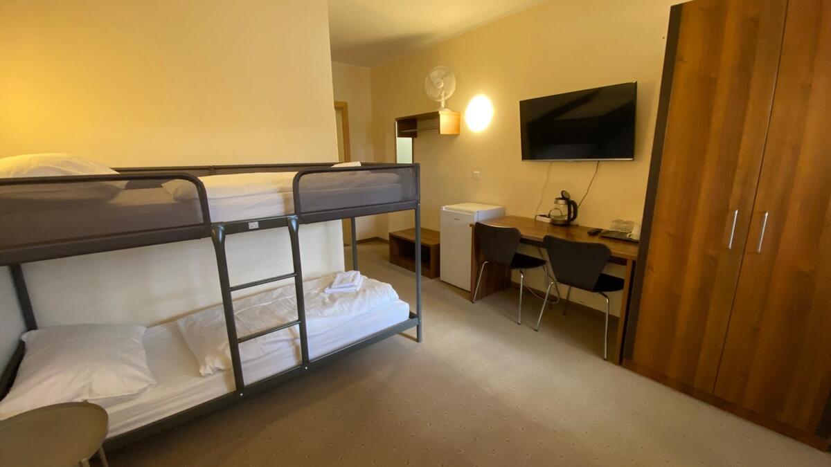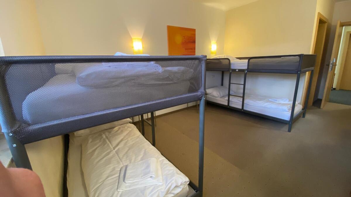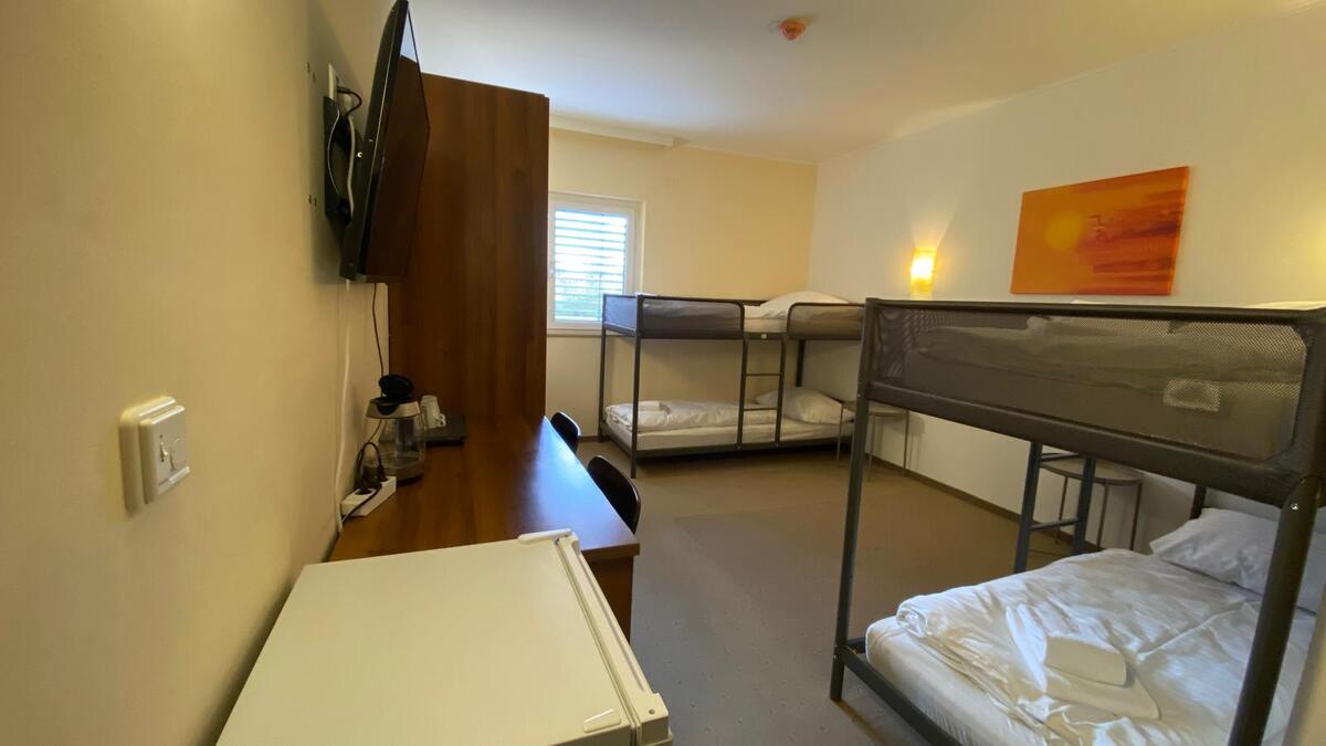 Das Vierbettzimmer bietet Platz für 4 Personen mit Etagenbetten. Freuen Sie sich auf kostenfreies WLAN, einen Flachbild-TV, einen Schreibtisch und einen geräumigen Kühlschrank.